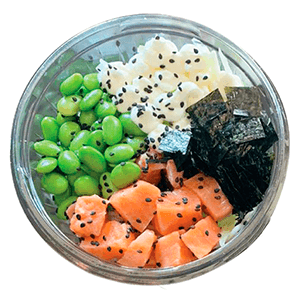 Base de pepino, con salmón, queso crema, edamames, alga nori y ajonjolí. 16 oz)
