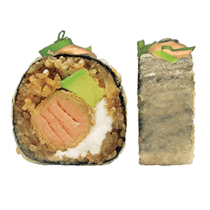 Por dentro: arroz frito, salmón empanizado, aguacate y queso crema. Por fuera: alga, cebollín, salsa de chipotle y así. Capeado. (303 gr)