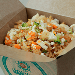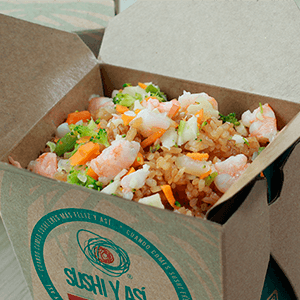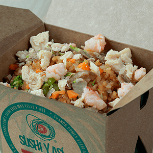 Arroz frito con mix de vegetales y un toque de soya, pollo, camarón y carne, queso crema y aguacate.