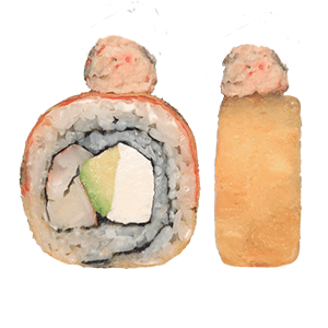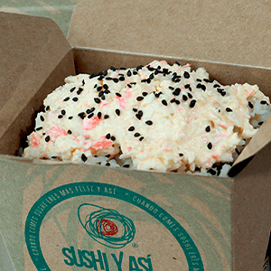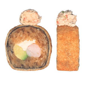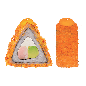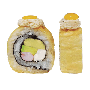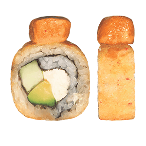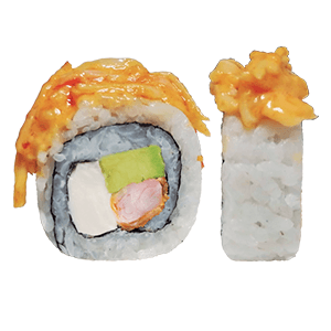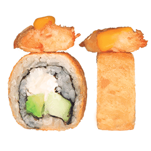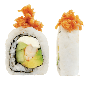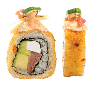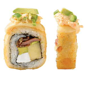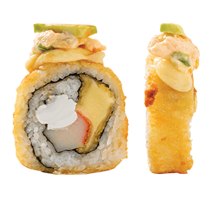 Por dentro: camarones capeados, queso crema y aguacate. Por fuera: empanizado, cangrejo spicy gratinado con salsa chipotle y así. (300 gr.)
