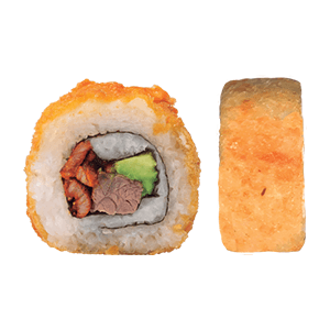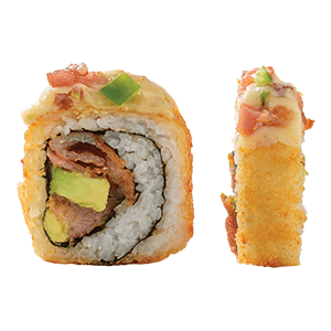 Por dentro: Milanesa de res, queso crema, aguacate, manchego. Por fuera: Empanizado, tampico, tocino, manchego, chipotle y así, soya y cebollín. (398 gr)