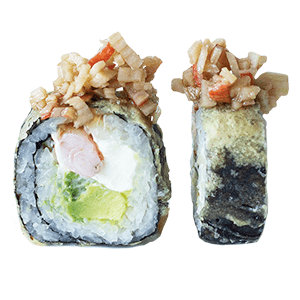 Por dentro: surimi, aguacate y queso crema. Por fuera: tampico, camaroncitos crunch y trocitos de pepino. (290 gr)