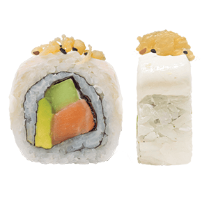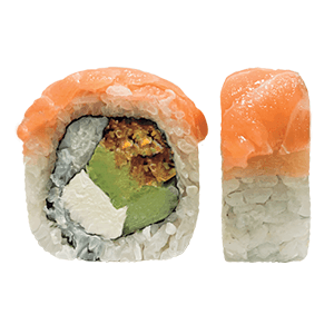 Por dentro: salmón, aguacate y pepino. Por fuera: queso crema, hojuelas de tempura y ajonjolí negro. (270 gr)