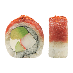 Por dentro: surimi, queso crema, pepino y aguacate. Por fuera: atún, salsa de anguila y chile de árbol. (320 gr)