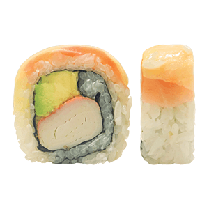 Por dentro: surimi y aguacate. Por fuera: salmón y queso manchego. (303 gr.)