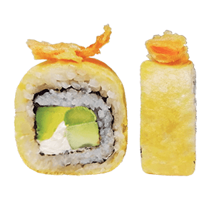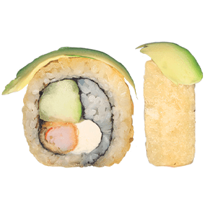 Por dentro: tampico y pepino. Por fuera: aguacate, queso crema, kakiage y ajonjolí. (300 gr)