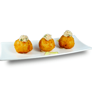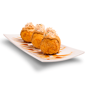 3 bolitas de arroz rellenas de queso crema, camarón y aguacate, empanizadas, con tampico encima, salsa de anguila, salsa chipotle y así. (180 gr)