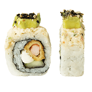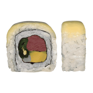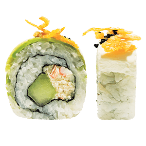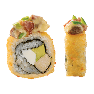Por dentro: surimi, queso crema, mini kushiages. Por fuera: empanizado, manchego gratinado, tampico, aguacate y salsa de anguila. (368 gr.)