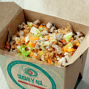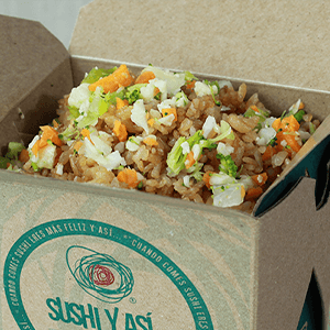 Arroz frito con mix de vegetales y un toque de soya, pollo, camarón y carne.