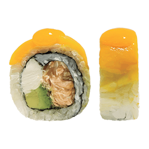 Por dentro: salmón empanizado, aguacate y queso crema. Por fuera: mango y salsa mango habanero. (358 gr)