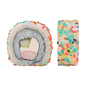Por dentro: camarón, pepino y queso crema. Por fuera: ajonjolí de colores. (245 gr)