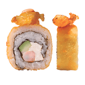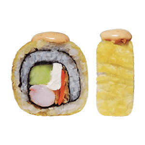 Por dentro: camarón, pepino, queso crema y kakiage. Por fuera: salsa chipotle y así. Capeado. (250 gr)
