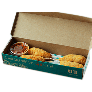 Tiritas crujientes de pollo, arroz con vegetales o 2 mini kushiages de queso. (310 gr)