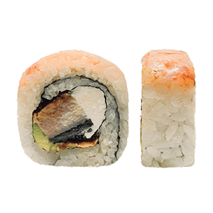 Por dentro: anguila, queso crema y aguacate. Por fuera: camarones a la plancha y salsa de anguila. (300 gr)