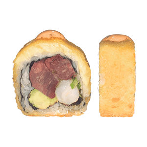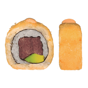 Por dentro: aguacate, pepino y queso crema. Por fuera: atún spicy. Empanizado. (288 gr)