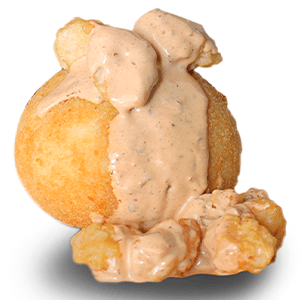 Por dentro: carne de trompo, arrachera y aguacate. Por fuera: queso manchego fundido. Empanizado. (275 gr)