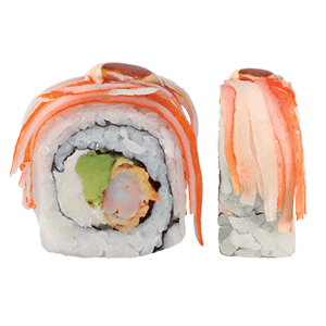 Por dentro: camarón capeado, queso crema y aguacate. Por fuera: kanikama, salsa de anguila, salsa chipotle y así. (300 gr)