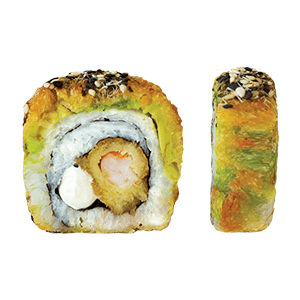 Por dentro: arroz frito, camarón, queso crema y aguacate. Por fuera: alga, topping de tampico. Empanizado. (295 gr)